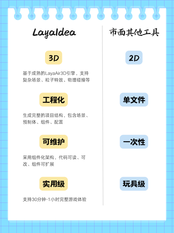 基于LayaAir引擎,,LayaIdea构建了一套完整的工业级AIGC开发流程,,实现了从策划文档到完整3D游戏项目的自动化生成,,与市面现有AIGC工具在技术能力、、、、实用性上形成显著差异,,,具体对比如下::::